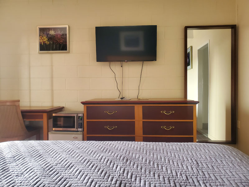 - Amenities: Air Conditioning, Alarm Clock, Dish (Direct TV with HBO channels), Flat-screen TV, Free toiletries, Free Wifi, Heating, Microwave, Mini-Fridge, No smoking, Toilet, Toilet Paper